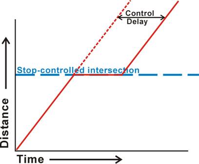 The definition of control delay is illustrated graphically above. While this illustration defines control delay for an approach to a stop-controlled intersection, the concept is equally applicable to signal-controlled intersection approaches.