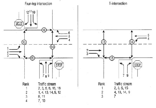 Each of the twelve possible movements at a TWSC intersection are numbered according the figure below. Four additional movements (13, 14, 15, and 16) are also shown, and represent possible pedestrian movements.