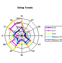 Exhibit 2-19 shows a radar plot of the delay trends. Each axis of the wheel is used