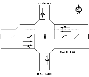 Page 1 of 2 Problem 2: Moe Road The intersection of Moe Road with Route 146 (Intersection B) is signalized and fully actuated. A picture of the site, taken from the perspective of the westbound approach, is shown in Exhibit 2-20. The lane configuration is depicted in Exhibit 2-21. The eastbound and westbound approaches are both three lanes wide (left, through, and through/right). The eastbound approach is shown here. A second picture of the westbound approach is shown here.