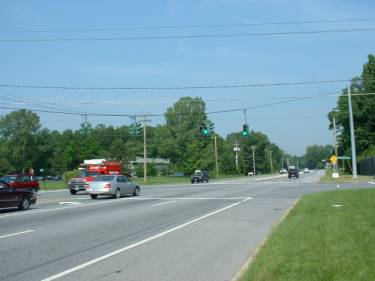 On the eastbound approach, the through lanes (through and through/right) continue east, while the westbound lanes taper to a single lane. You can see the taper in the distance in the photograph. Click here to see a close-up. The northbound and southbound approaches are both one lane wide (left/ through/right). The northbound approach is shown here and the southbound approach is shown here. The eastbound traffic arrives in platoons, discharged from the upstream intersection at the entrance to the Shenendehowa campus. (see Problem 3.) The westbound traffic also arrives in platoons, discharged by the Maxwell Drive intersection (see Problem 1). The distance to these intersections is such that the signals tend to synchronize antagonistically. That means the platoons tend to arrive on red. As a result, we’ve assumed arrival type 2 for both approaches. The north and southbound traffic arrives randomly, so we’ve assumed arrival type 3. Another intersection less than a mile to the south provides access to the Shenendehowa main campus; but most of the time, the signal is green north-south, since the only traffic on the side street is going to and from school parking lots. |